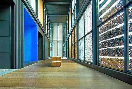 Outside is a courtyard with a small cafe, tables and chairs, where informal performances of all kinds take place during the afternoon. The whole rectangular site of the Pavilion is enclosed within a cloister, The walls of the cloister consist of large square double-glazed panels, Each panel is filled, not with stained glass, but with myriad small objects, natural or man-made. One panel may be filled with poppy seed cases, another with wood shavings. Others may contain hundreds of plastic toothbrushes, light bulbs, cassette cases or tea strainers. The effect is magical.